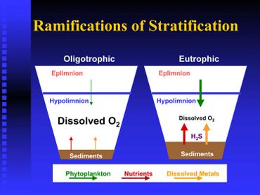 Stratification of lakes - A layering effect produced by the warming of the surface waters in many ponds and lakes during summer. The upper waters are progressively warmed by the sun and the deeper waters remain cold. Because of the difference in density (warmer water is lighter), the two layers remain separate from one another. Overall, the upper waters "float" on deeper waters and wind induced mixing occurs only in the upper waters. Oxygen in the bottom waters may become depleted. In autumn as the upper waters cool, the whole lake mixes again and remains mixed throughout the winter, or until it freezes over.