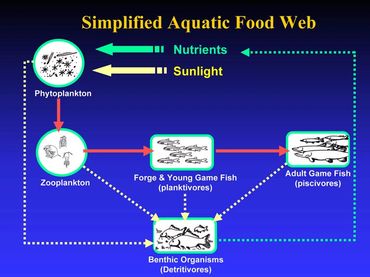 The transfer and flow of energy in ponds and lakes is ultimately controlled by complex interactions between various groups of aquatic organisms (both plants and animals). A simplistic diagram of these interactions among aquatic organisms is shown as Figure 1. In Figure 1, algae (phytoplankton) and aquatic macrophytes (plants) capture energy from the sun and convert this energy into chemical energy through the process known as photosynthesis. During photosynthesis, carbon dioxide, nutrients, water and captured sunlight energy are used to produce organic compounds (chemical energy), which are then used to support further growth and reproduction.